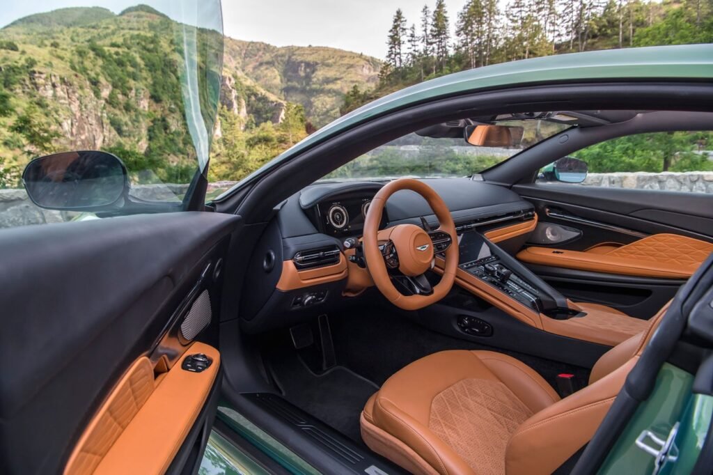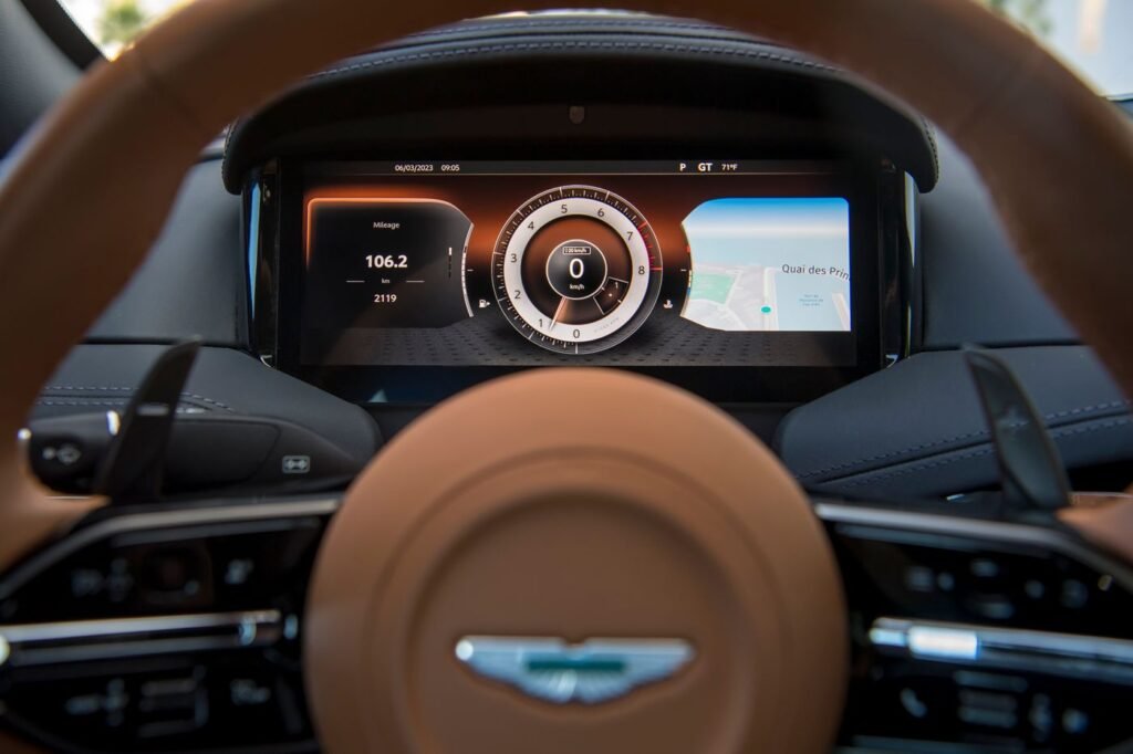 A Driver-Centric Experience: The DB12’s interior design is centered around the driver, emphasizing a seamless connection between the car and the person behind the wheel. The infotainment screen is strategically positioned to avoid distraction, keeping the driver’s attention firmly on the road ahead. The heads-up display (HUD) provides essential information without compromising on simplicity and clarity. The adjustable steering wheel is equipped with oversize paddle shifters, ensuring confident gear changes and enhancing the car’s sporting credentials.