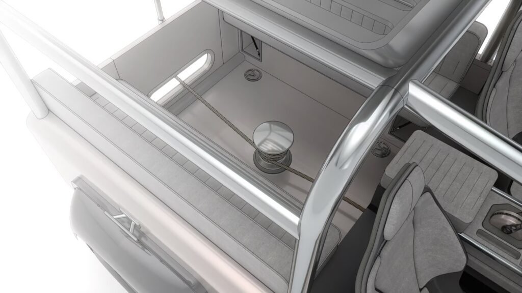 Ensuring the safety and security of the Shore Tender while aboard the superyacht, Everrati has incorporated removable tie-off capstans. These practical additions provide a secure anchoring point, allowing for easy and efficient stowage of the Tender. The seamless blend of functionality and style exemplifies the thoughtful design philosophy behind this exceptional electric vehicle.