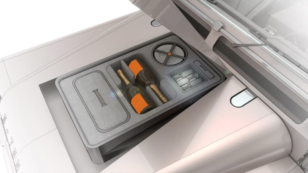Everrati’s attention to detail is evident in the bespoke features of the Shore Tender. A specialized champagne chiller graces the under-hood bay, repurposing the space once occupied by the traditional engine. This elegant touch adds a touch of extravagance, allowing passengers to indulge in a chilled glass of champagne while soaking in the picturesque views of the open sea.