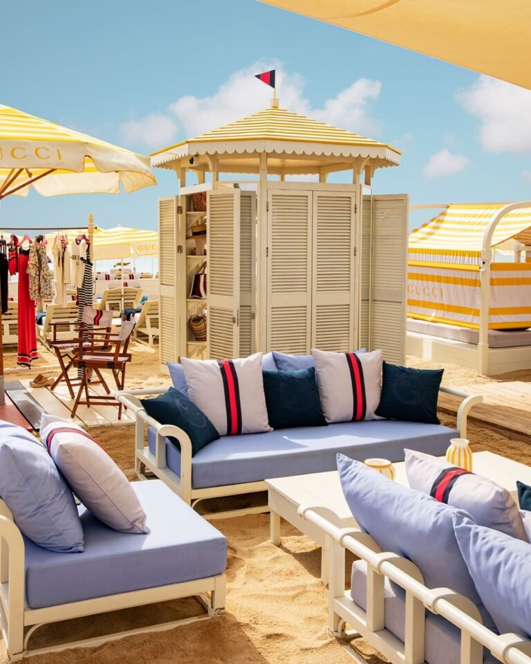 Gucci’s signature GG motif takes center stage, adorning every corner of the Loulou Ramatuelle beach area. From parasols that offer respite from the Mediterranean sun to plush daybeds and stylish deck chairs, the GG motif and a palette of vintage blue and mimosa yellow envelop the surroundings. This chromatic code elegantly complements the azure hues of the sea, creating an atmosphere that feels as though it’s been plucked from a dream.