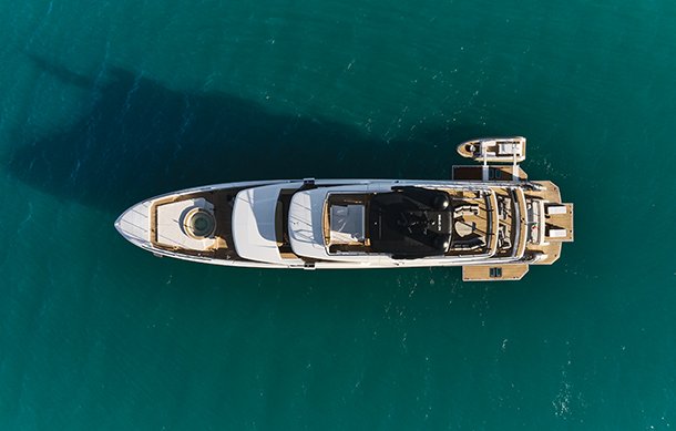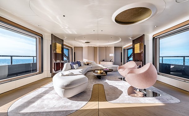 - Shifting Material Positions The original Motopanfilo yachts featured small portlights, mahogany paneling, and white trim and ceilings. To breathe new life into the design, the designers reversed this rapport in the main deck saloon. Glass replaced mahogany, allowing for a harmonious connection with the surrounding environment. Additionally, wood was thoughtfully positioned on the ceilings and floors, enhancing the yacht’s natural ambiance and connecting its occupants with the soothing embrace of the sea.