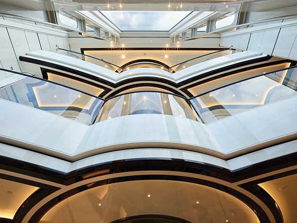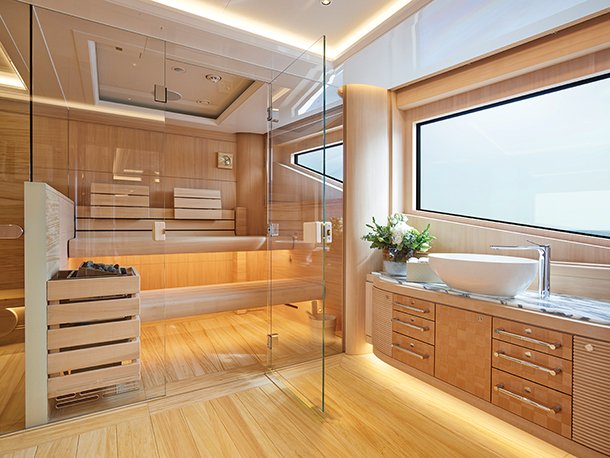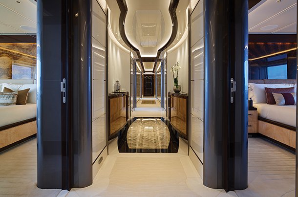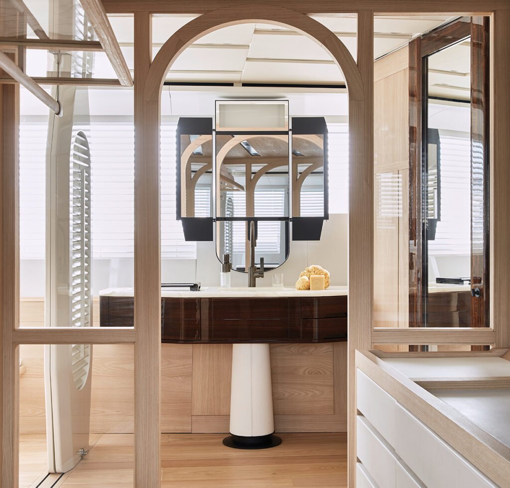 - Lighter Wood and Integrated Mirrors In a bid to infuse the yachts with a contemporary touch, a lighter wood was chosen for the redesign, enhancing the sense of space and light. A seamless integration of mirrors was incorporated to amplify the feeling of openness, creating an interplay between the yacht’s interior and its breathtaking exterior surroundings. This innovative use of mirrors adds an element of surprise and enchantment, while reflecting the essence of the original design.